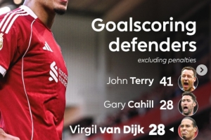 本场比赛范戴克打进一球,英超官方统计,范戴克在英超非点球破门次数追平卡希尔,并列英超后卫次席。以下为英超历史后卫非点球破门次数榜: