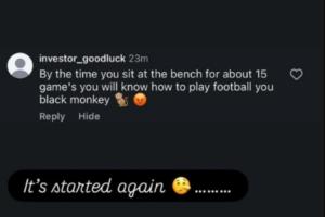 今日塞梅尼奥更新个人ins,晒出有人对自己种族歧视辱骂。该网友骂塞梅尼奥:当你坐替补席15场比赛后,你就知道怎么踢球了,你这只黑猴子。